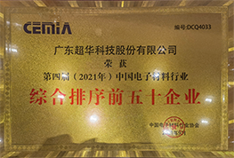 廣東超華科技有限公司榮獲第四屆(2021年)中國(guó)電子材料行業(yè)綜合排序前五十企業(yè)。
